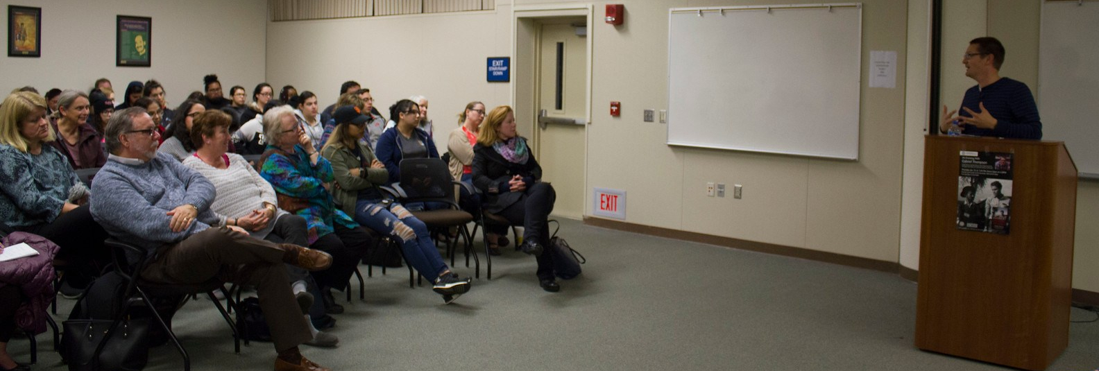 Gabriel Thompson speaks to the packed room
