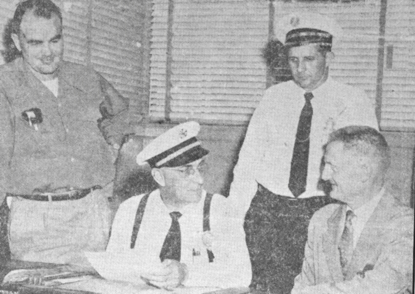 Beaty, football coach; Chief Phil Pifer (seated); Robert Padock assistant chief, and Norman Harris, coordinator of technical vocational education at Bakersfield College (right), meet to plan college and on-the-job training for city fire department trainees.
